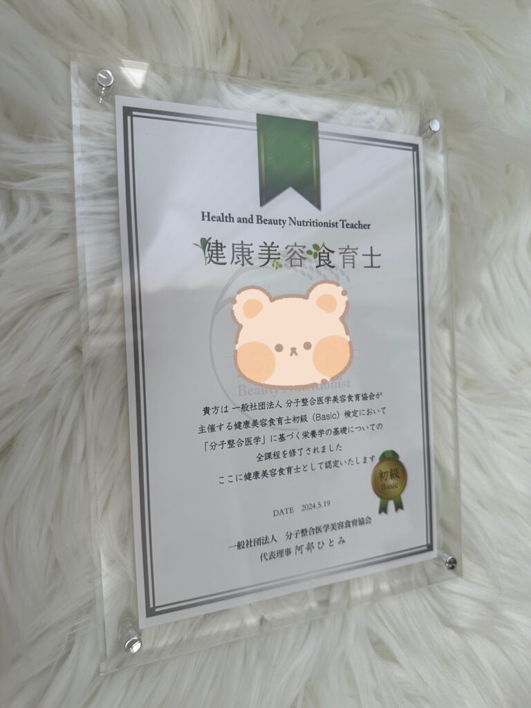 私が知人に教えてもらって取得した健康美容食育士とは、一般社団法人 分子整合医学美容食育協会という、分子栄養学が学べるファスティングマイスター学院で講習を受け資格を取得しました。
